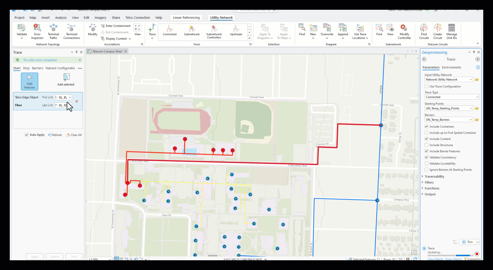 Using the utility network tool gallery, we will chose the connected trace option. Opening the geoprocessing tool, we check the boxes for containers and content to ensure spatial and nonspatial features are included in our results. Running the trace returns the path for strand 1 in our cable, visualizing it along with its devices.