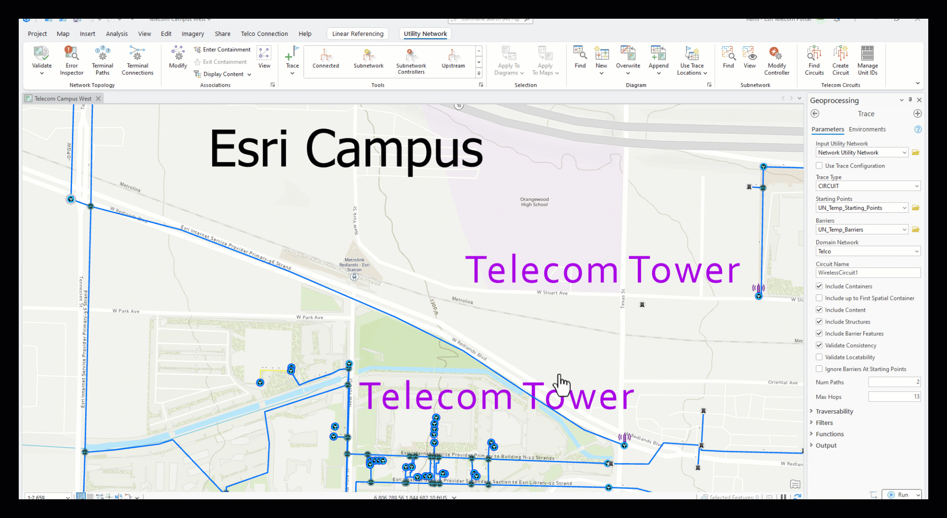As an example of the new circuit management capabilities, let’s explore a circuit that represents the backbone connection between the Esri Internet Service Provider (ISP) and the northern tap off of the University campus. Leveraging the Modify Circuit tool (see Image 3 below), we can explore the details of this circuit’s location.