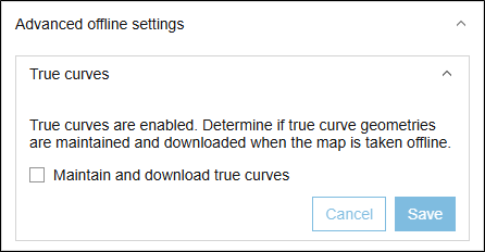 In the Advanced offline settings section, you can check the box to maintain and download true curves. By default, this option is not enabled, and when using offline map areas prepared ahead of time, true curve features are densified upon download. These features can still be edited, but behavior during sync will vary depending on how the web feature layer feature access properties are configured.