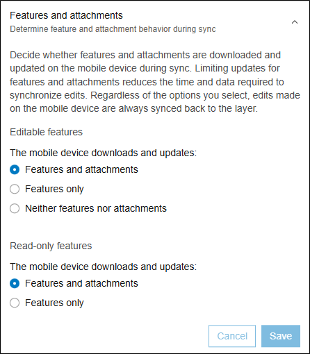 In the Features and attachments section, you can set how attachments and features are delivered to clients. These settings can be configured for editable and read-only features. They will be used when the offline map area is downloaded for the first time and for each time data updates are synchronized from the map in the organization.