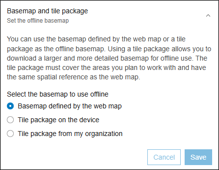 In the Basemap and tile package section, you have the option to choose between using the basemap defined by the web map or a tile package when an offline map area prepared ahead of time is taken offline. Tile packages allow you to use a larger file and can be useful if you have your own highly detailed or customized imagery and basemaps that you would prefer to use.