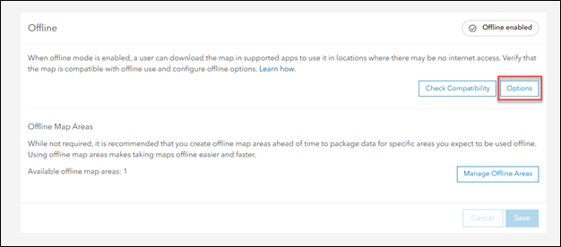 2. On this page, in the Offline section, click Options to access the additional settings for features and attachments, as well as basemap and tile package.