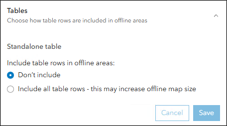 In the Tables section, you can determine how records within a standalone table are delivered to clients. The Don’t include option will exclude all current records and a blank table will be seen with the necessary fields to be used for data collection. Include all table rows will prepackage all the records within the standalone table. This option may increase the offline map size so choose the option that makes sense depending on what users need for offline use.