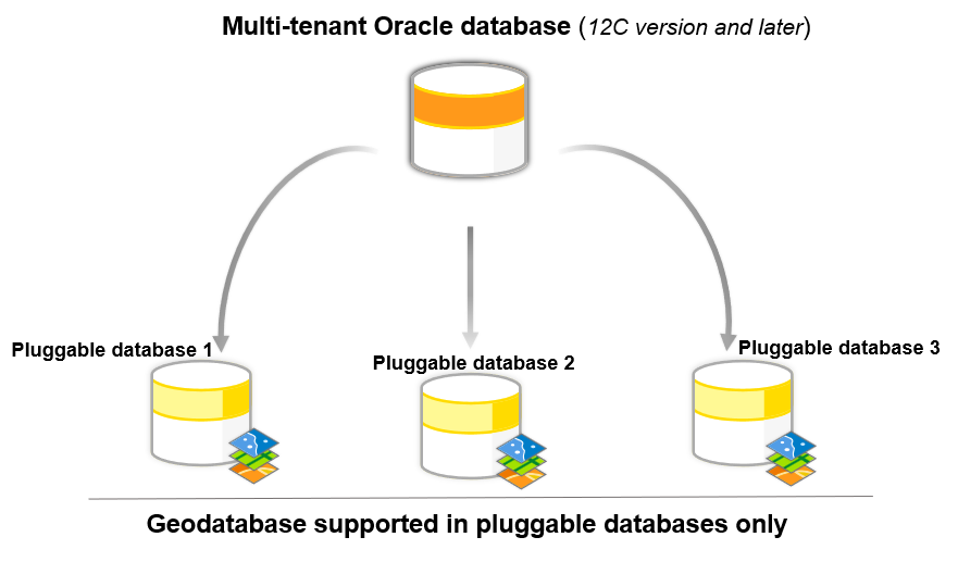Oracle’s multitenant architecture has a container database (CDB), which can store multiple pluggable databases (PDBs). A PDB is a portable collection of schemas, schema objects, and non-schema objects that appears to an Oracle Net client as a database. In Oracle multitenant architecture, you can create geodatabases in a PDB only.