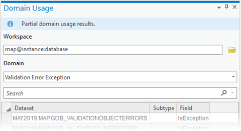 Working with enterprise geodatabases, you may receive partial results for datasets that are using a specific domain. This will depend on the user in the workspace provided and means the user you are connected as does not have privileges to see some of the datasets the domain is assigned to. A banner will be displayed if this is the case saying, ‘Partial domain usage results.’