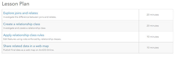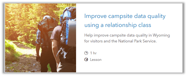 This blog article is a follow-up to the Improve campsite data quality using a relationship class Learn ArcGIS lesson. In the one-hour lesson, a regional GIS specialist has been tasked with improving campsite data quality in Wyoming. The specialist addressed loss of data at the park level by creating joins and relates and enforced spatial data integrity by creating a one-to-many relationship class between campgrounds and campsites feature classes.