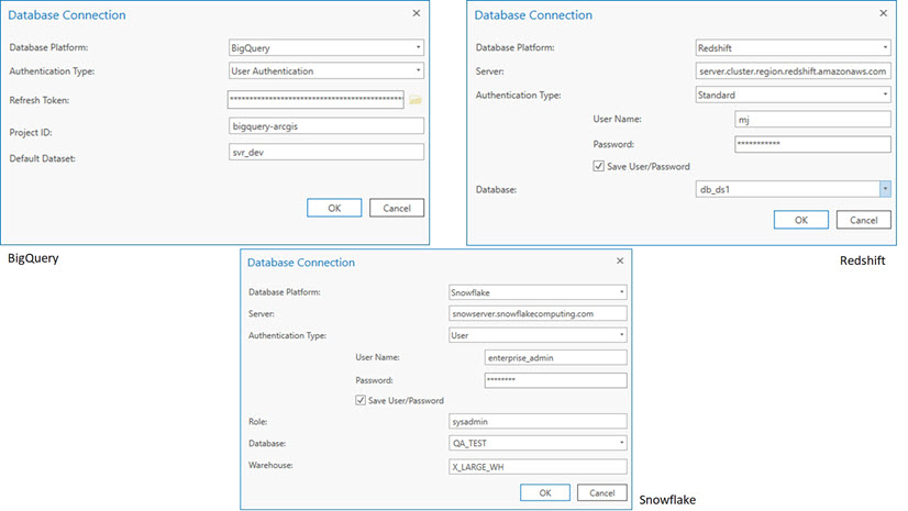 The Database Connection dialog now supports establishing connections to these cloud data warehouses. Create a database connection to view and explore the objects in a cloud data warehouse from the Catalog pane in ArcGIS Pro.