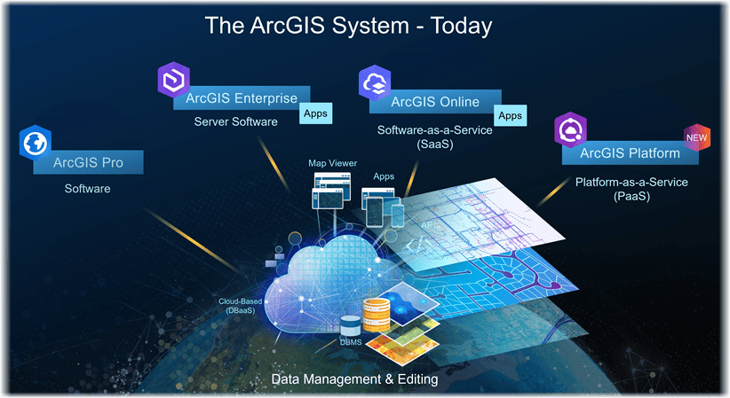 ArcGIS Pro uses a project-centric approach to keep all your maps, layouts, tools, geodatabases, and connections in one place. This enables you to better collect, store, maintain, prepare, and share your data across a suite of ArcGIS products, such as ArcGIS Online and ArcGIS Enterprise, and work across the ArcGIS system through Web GIS.