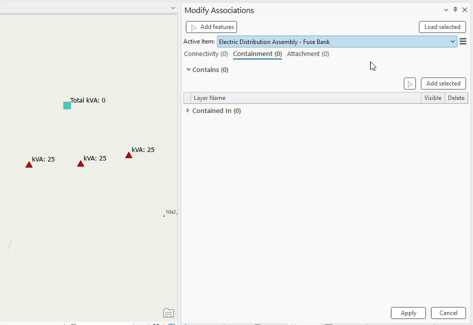 Consider this example: A transformer bank assembly feature has a totalKva double field. We want to author an attribute rule such that every time a new transformer unit device is associated with the bank (through a containment association), the new total is updated in the assembly. This total should be equal to the sum of the kva field values in all transformer content.