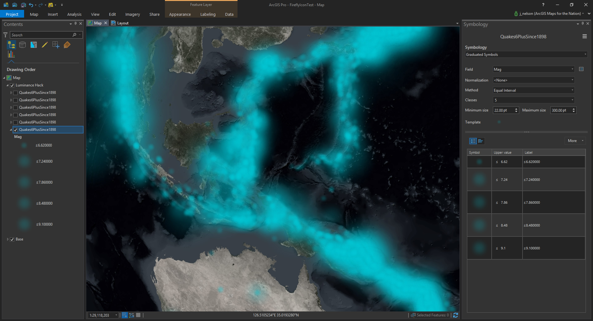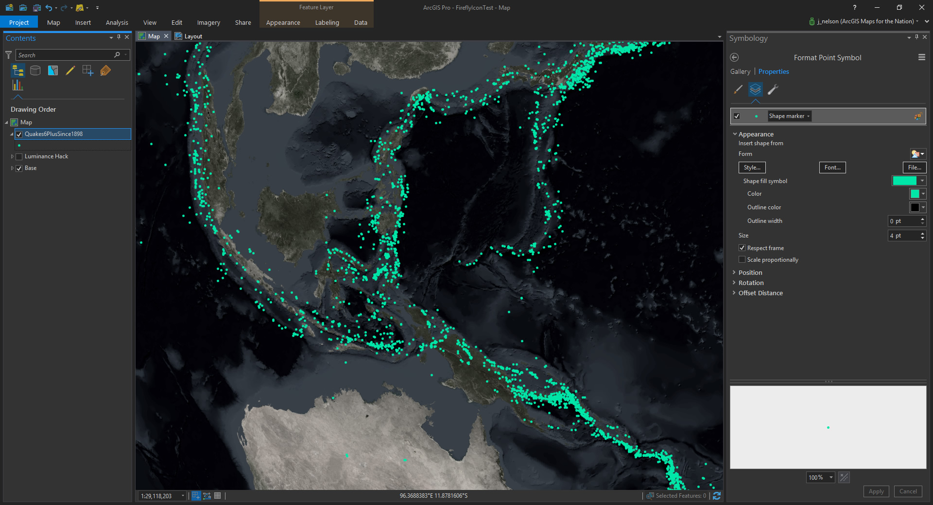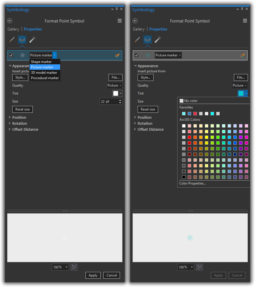 Let’s see how this looks in ArcGIS Pro. I’m using the glow image (provided above) as a picture marker. And I’ve applied a tint to dye them a blueish color.