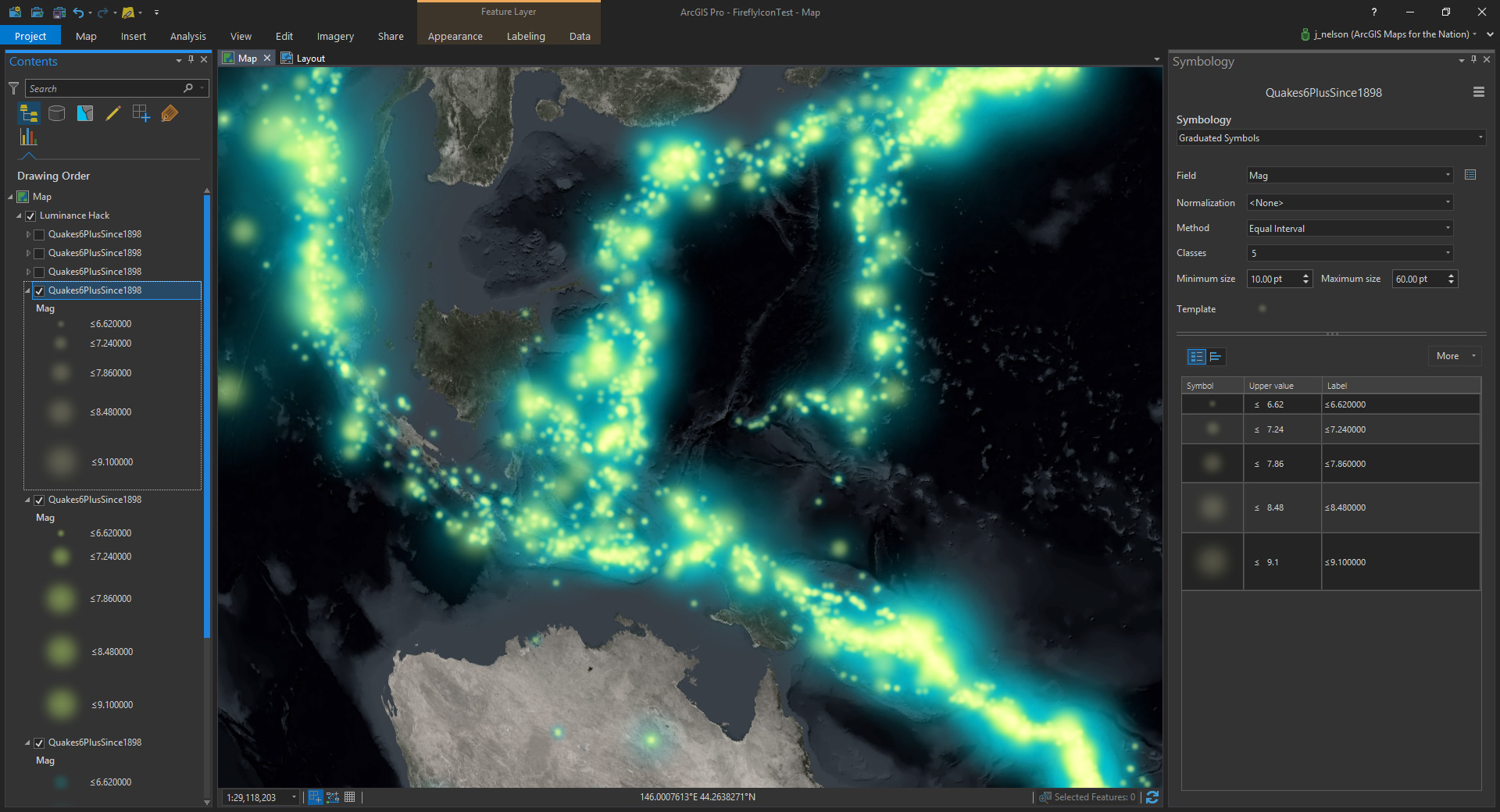 Here is a look at earthquakes, with a standard symbol marker. Lots of quakes. But the thing about quakes, and just about everything else, is that they aren’t so discrete and tidy as these symbols make them appear. They radiate energy outward and make their presence known to their surroundings.