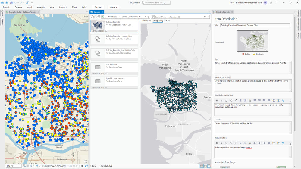 Not only was the building permit data written to a feature class, but it also had metadata generated by an ETL process. In the screenshot below, we are viewing the metadata for the BuildingPermits feature class in ArcGIS Pro. Here we can see the item information (title, tags, summary, description, credits, use limitations).