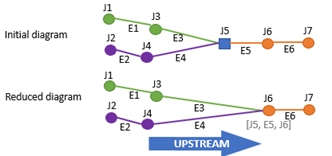 The reduction of diagram junctions with three adjacent junctions or more is not tied to any specific setting. Such a diagram junction is systematically reduced to the upstream junction when this junction is unique. When more than one upstream junctions is detected, there is no reduction. For example, to reduce the blue node J5 below, the process retrieves all the junctions that are upstream of it. 1. In the sample below, since it detects a unique upstream junction J6, the reduced junction J5 and the edge between J5 and J6 are systematically reduced to J6. ![]() 2. In this second sample below, since both J3 and J4 are upstream to the J5 junction to reduce, the process detects multiple upstream junctions and J5 cannot be reduced. ![]() |
