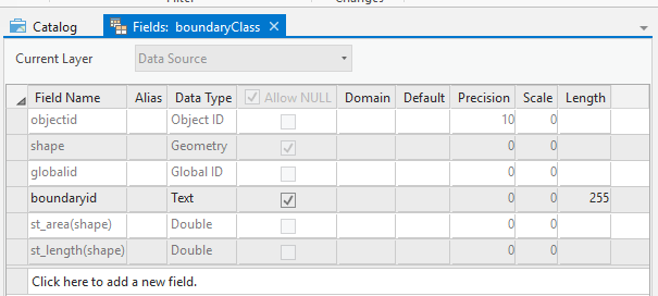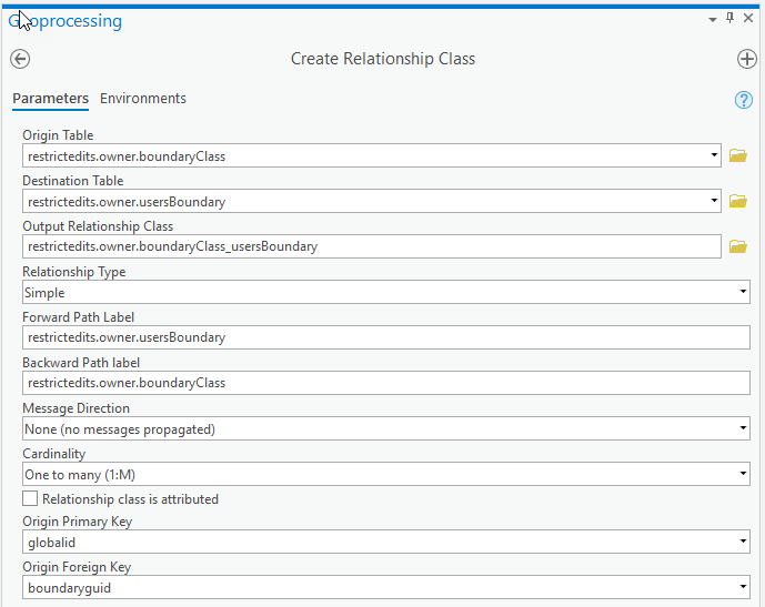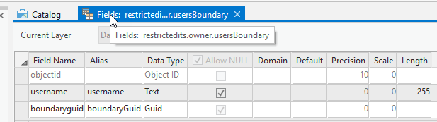 First we will need an extra table that have the users assigned boundaries. Create a usersBoundary table, with a username text field and a boundaryGuid field foreign key to the globalId of the boundaryClass. We will also create a relationship class between the boundaryClass and the usersBoundary table. You don’t have to create the relationship, but it will allow us to assign multiple users to a boundary and will simplify editing the table in Pro.