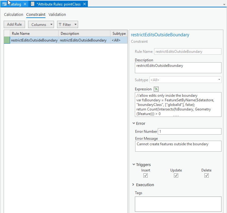 In this example we want to create a boundary feature class which will represent the restrictive zones or areas. We will also create another feature class that represents the data; Finally we will add an attribute rule to the feature class that checks if the feature being created or updated is within the boundary.