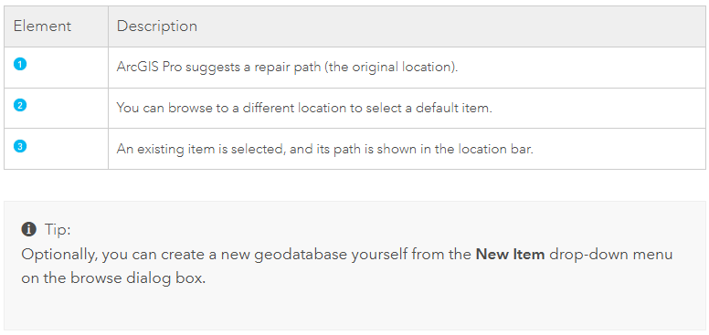 If you don’t want ArcGIS Pro to manage default project item repair, you can set the item handling options to prompt you to select a different item. These options also allow you to create a new default item in a location you choose.