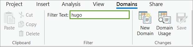 In the Domains view for the geodatabase, we can easily see that Hugo owns four attribute domains, but in a production geodatabase it may be necessary to use the Filter Text box to help filter only domains owned by a specific user.