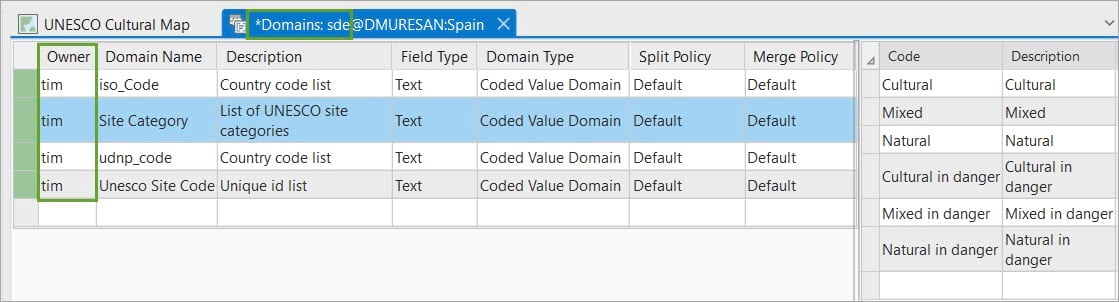 When working in an enterprise geodatabase, domains have ownership associated with them. Similar to feature classes and tables, they are owned by the user that is connected when they are created. While any user can create or assign domains to their own datasets, only the owner of a domain can edit the domain properties. This means that only the owner can modify properties of the domain and perform operations like adding new value and descriptions for coded value domains.