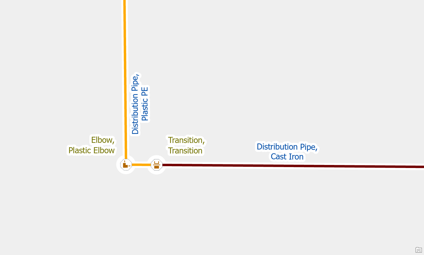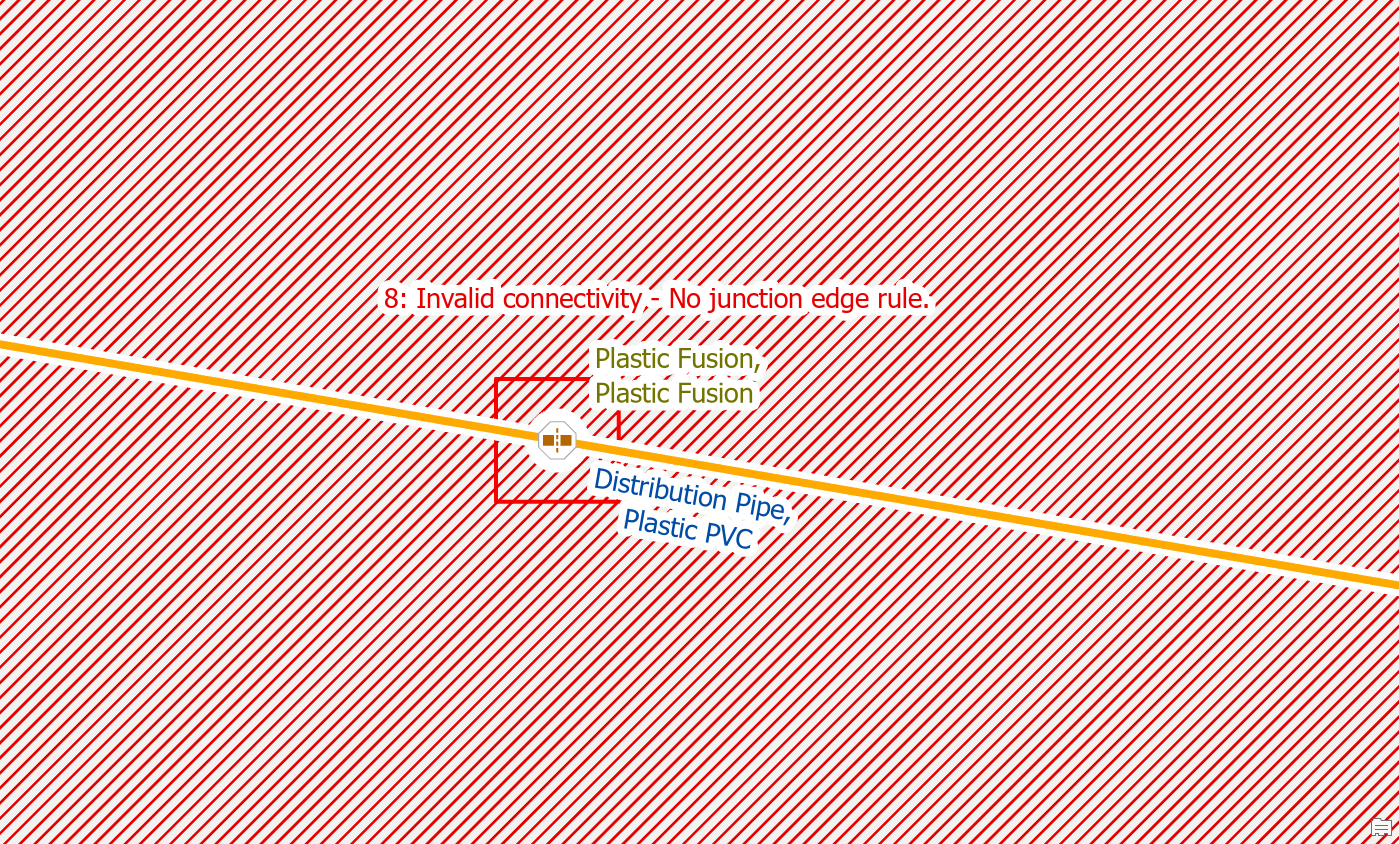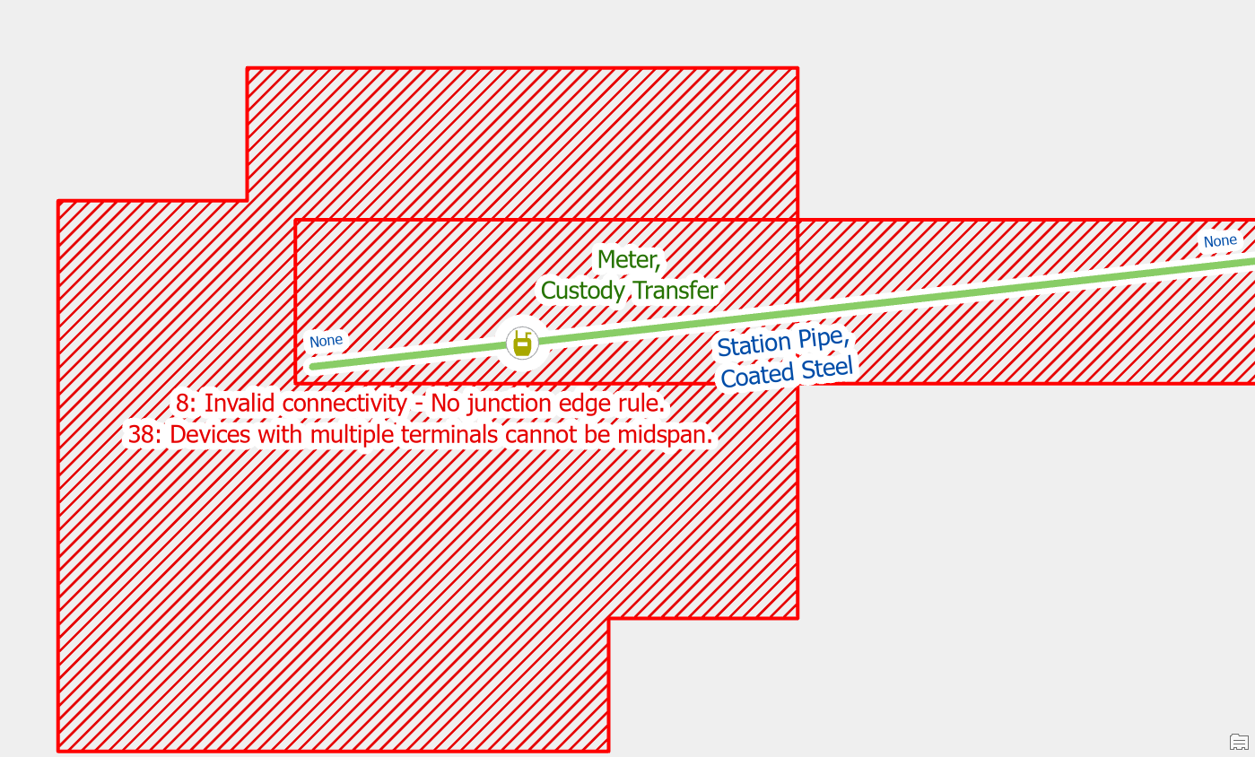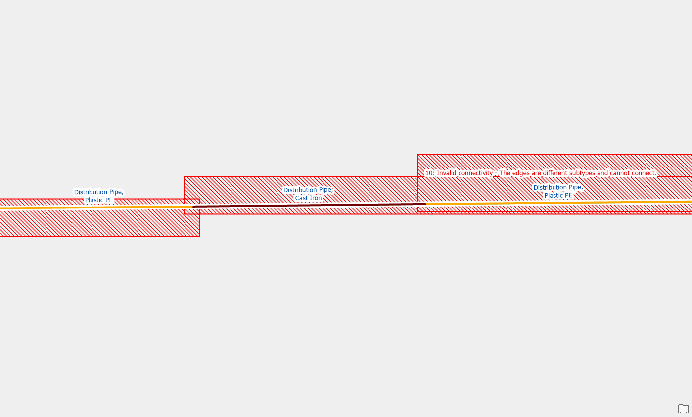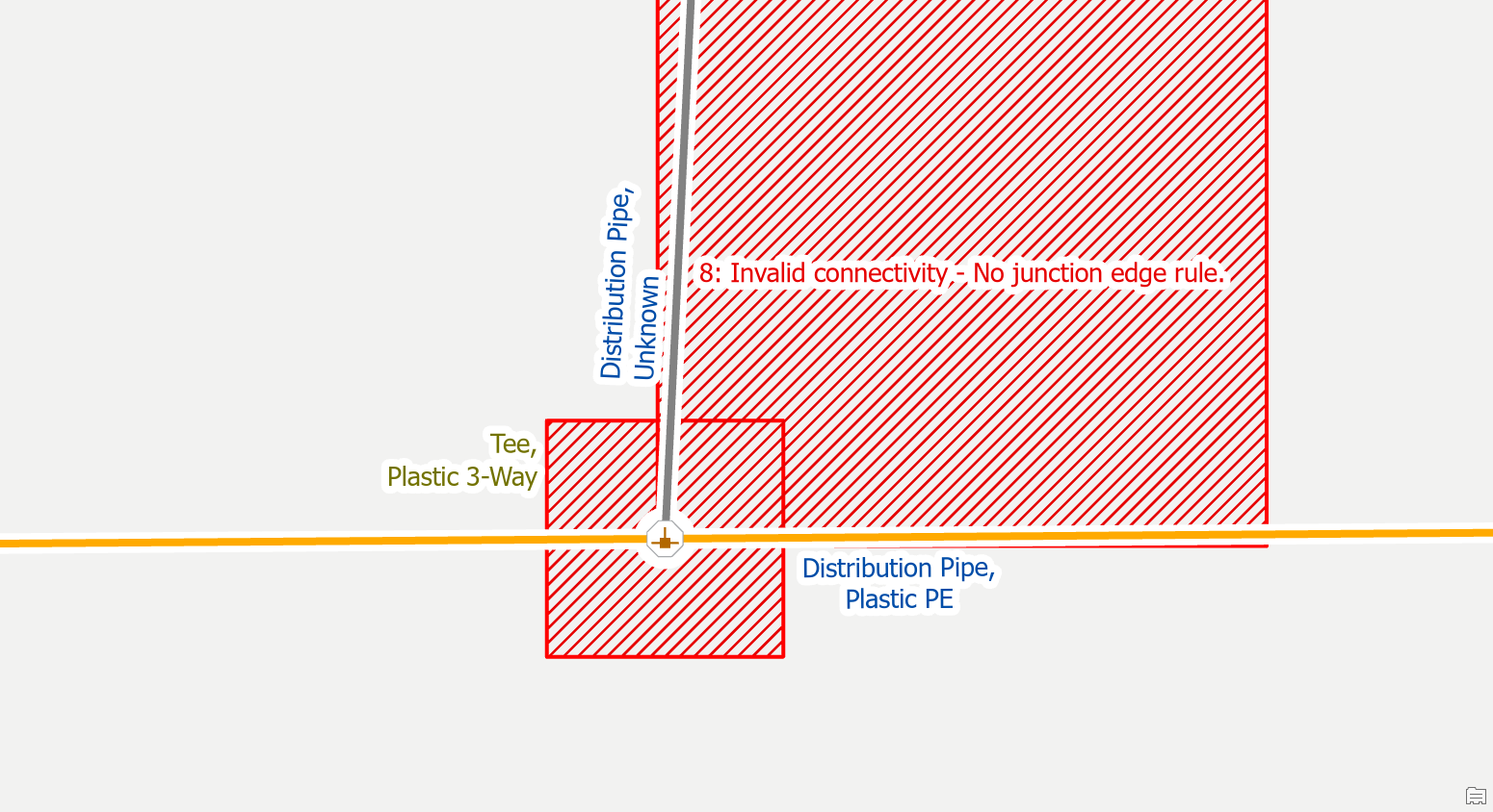 In the gas data model, the assetgroup defines the type of pipe or wire, such as service pipe, distribution pipe, and station pipe. The assettype defines the generic type of material of the pipe, such as coated steel, and plastic PE. When connecting two pipe segments, the unique combination of assetgroup and assettype must match for automatic connection. If the two pipe segments are different, this will generate an edge-to-edge rule error.