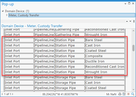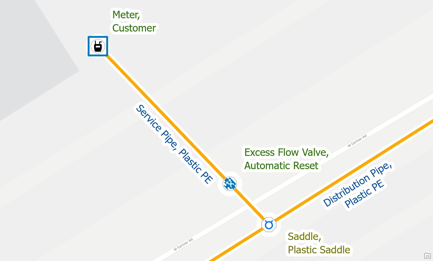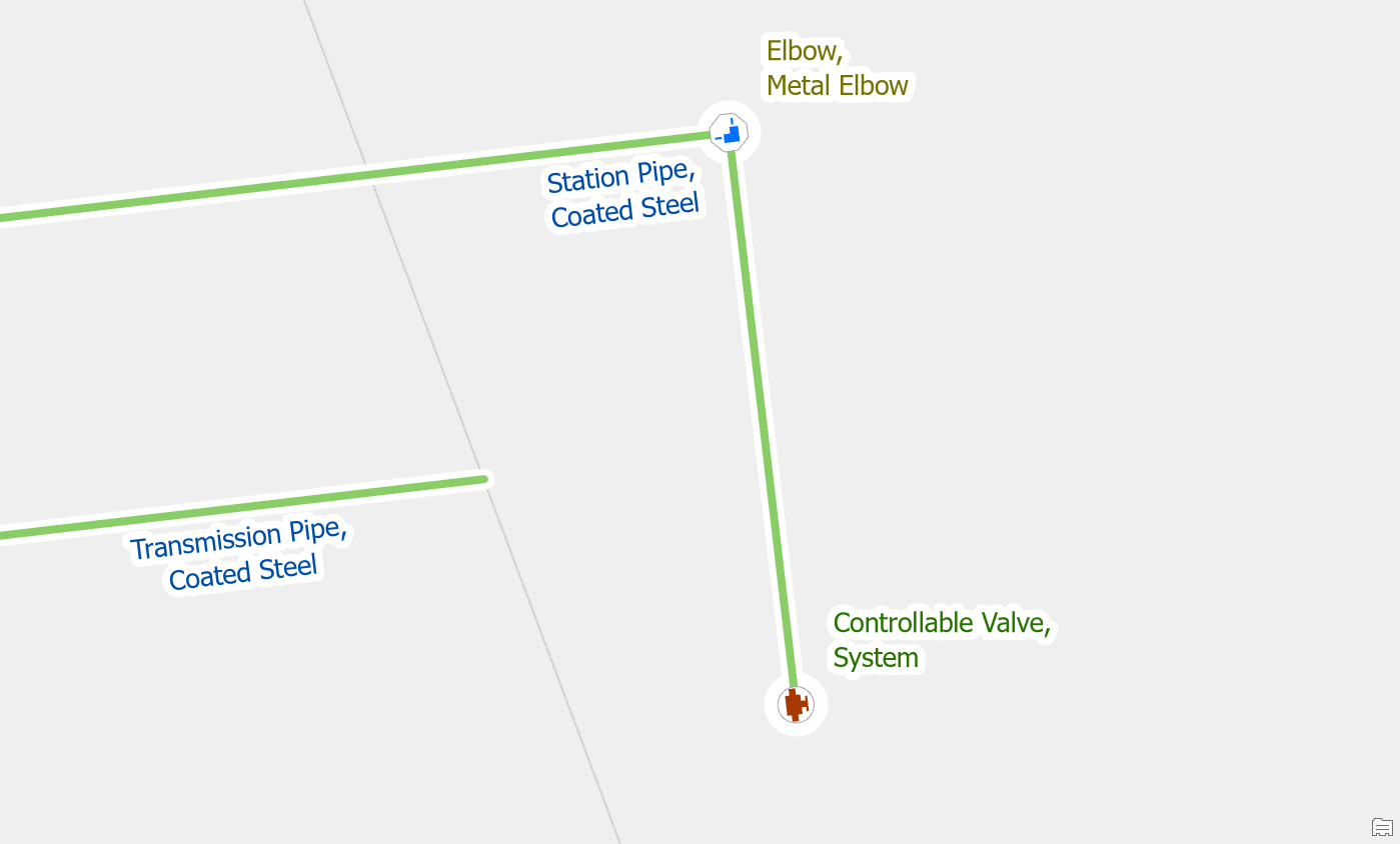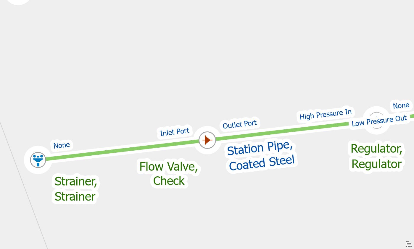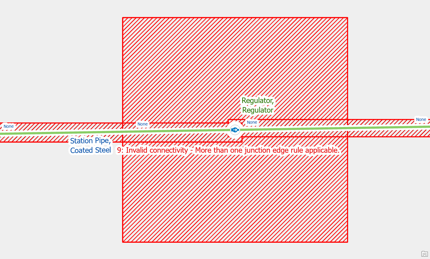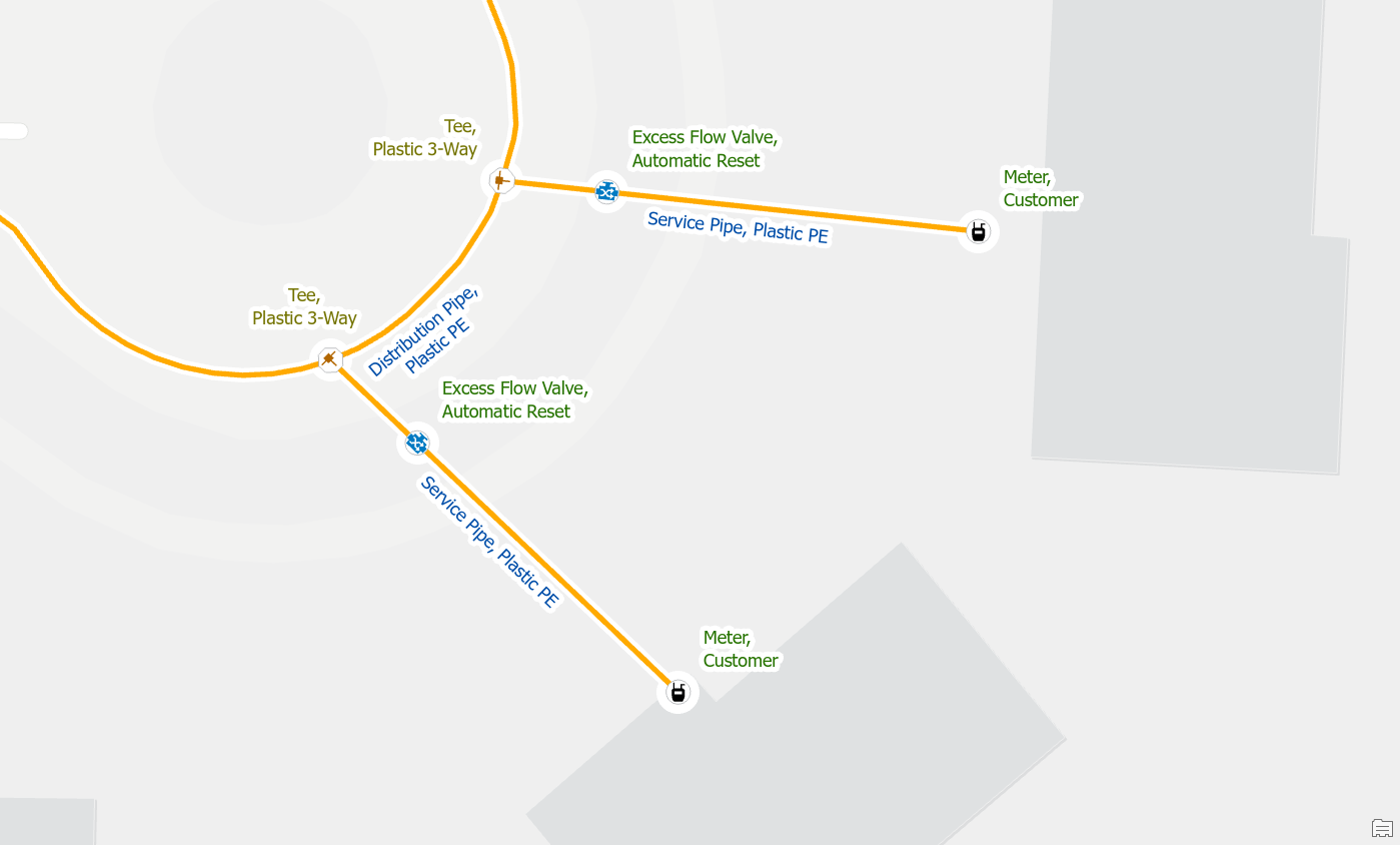 In the gas data model, the assetgroup defines the type of pipe or wire, such as service pipe, distribution pipe, and station pipe. The assettype defines the generic type of material of the pipe, such as coated steel, and plastic PE. When connecting two pipe segments, the unique combination of assetgroup and assettype must match for automatic connection. If the two pipe segments are different, this will generate an edge-to-edge rule error.