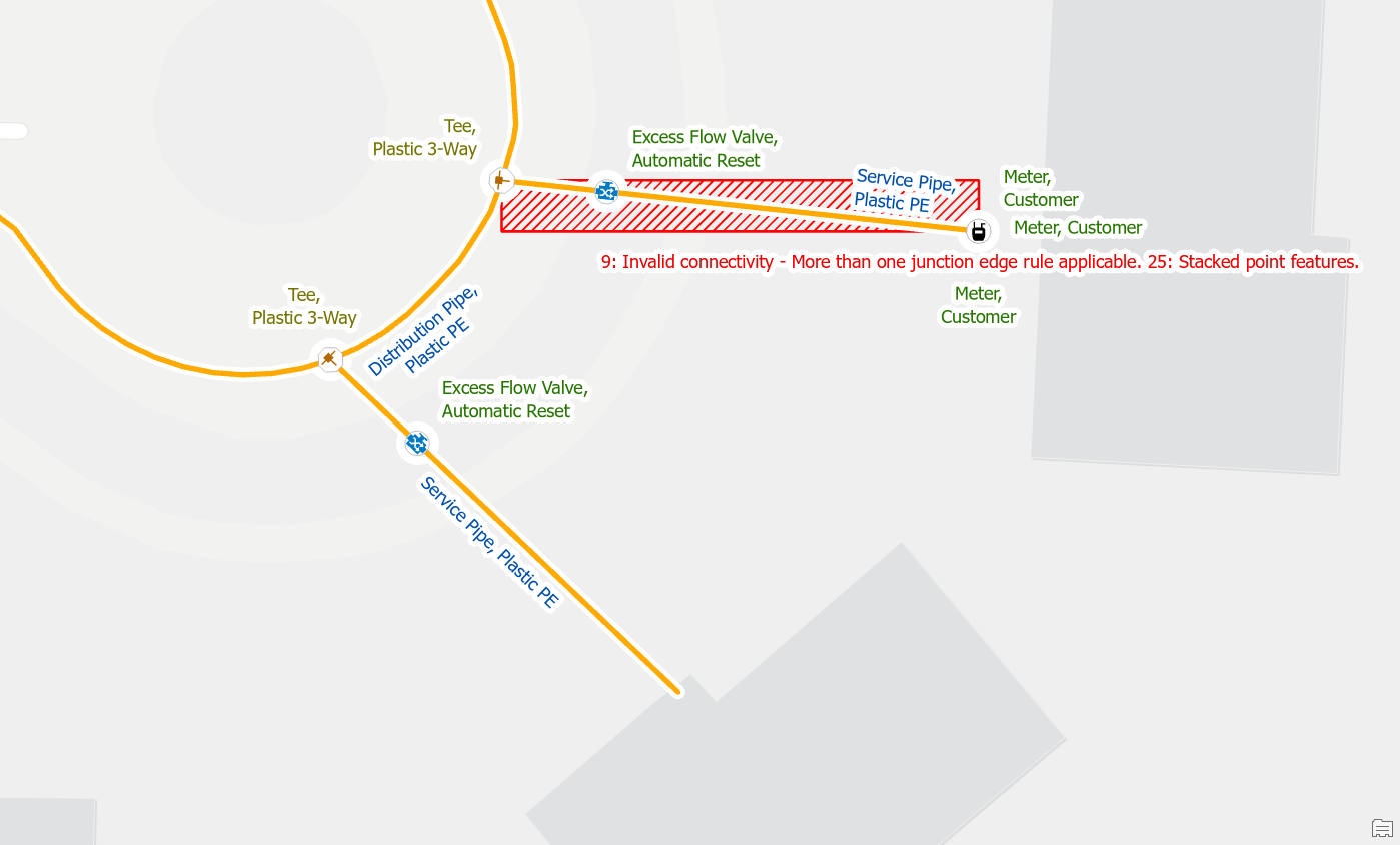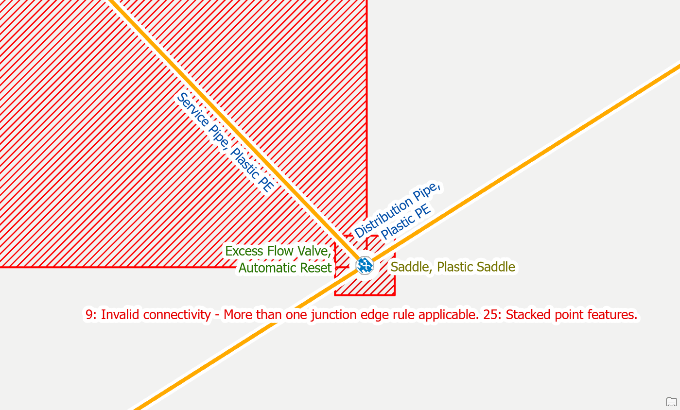 In the field we know that these two features are very unlikely to be physically stacked on top of each other. They are most likely within 12 inches of each other, but horizontally spaced apart. To resolve these errors, you can offset the excess flow valve by moving it away from the saddle, along the service line. By unstacking the junction and device you will clear all the errors associated with that location.