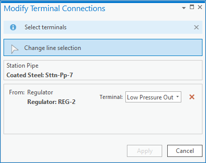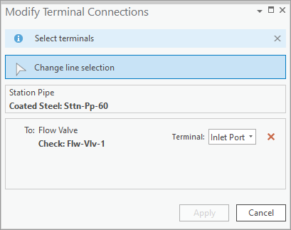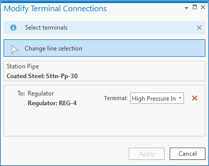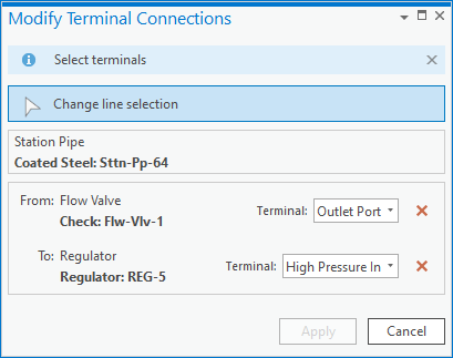 After deleting the regulator, we get errors on the pipes it was connected to saying we’re connected to an invalid terminal. The recommended way to fix the error is to use the Modify Terminal Connections pane to correct the issue. Delete the invalid connection and click Apply.