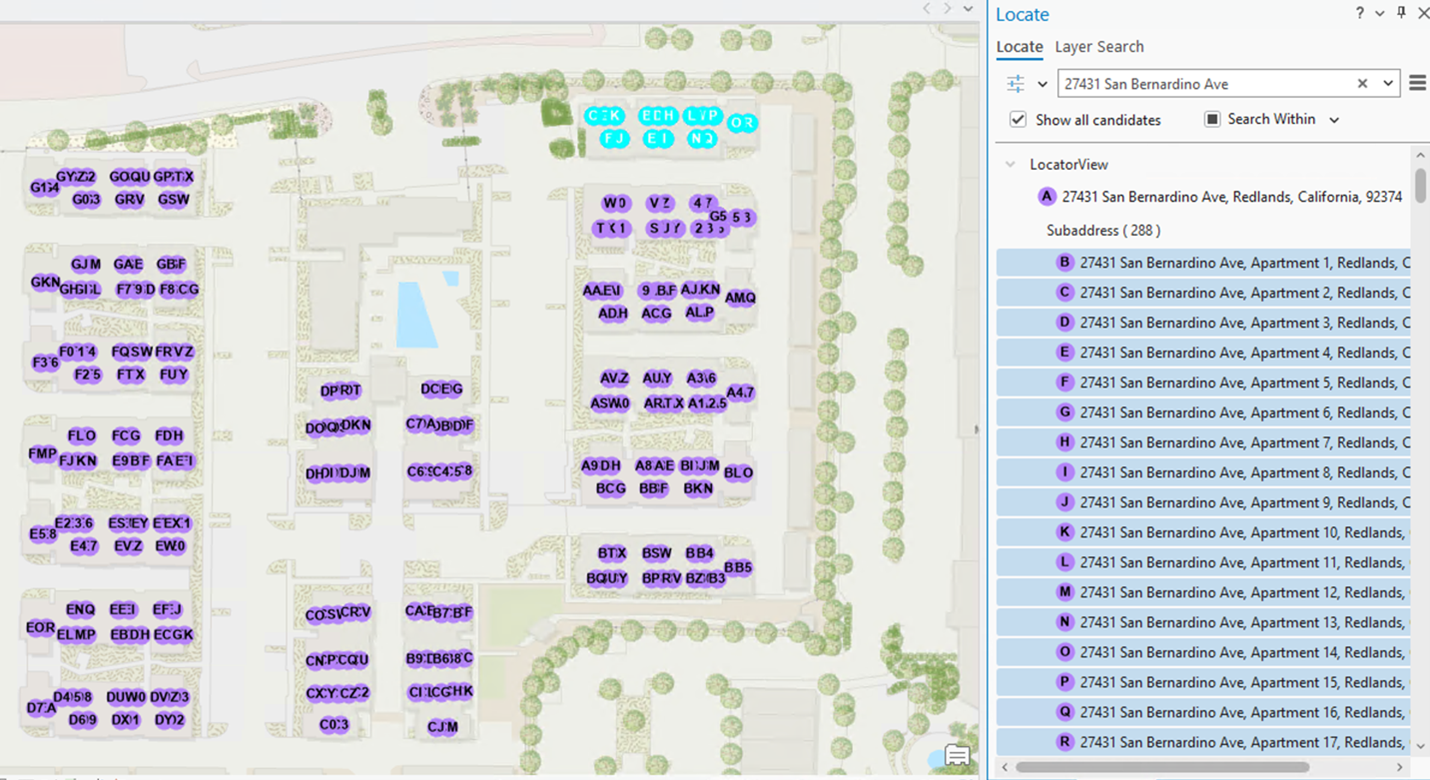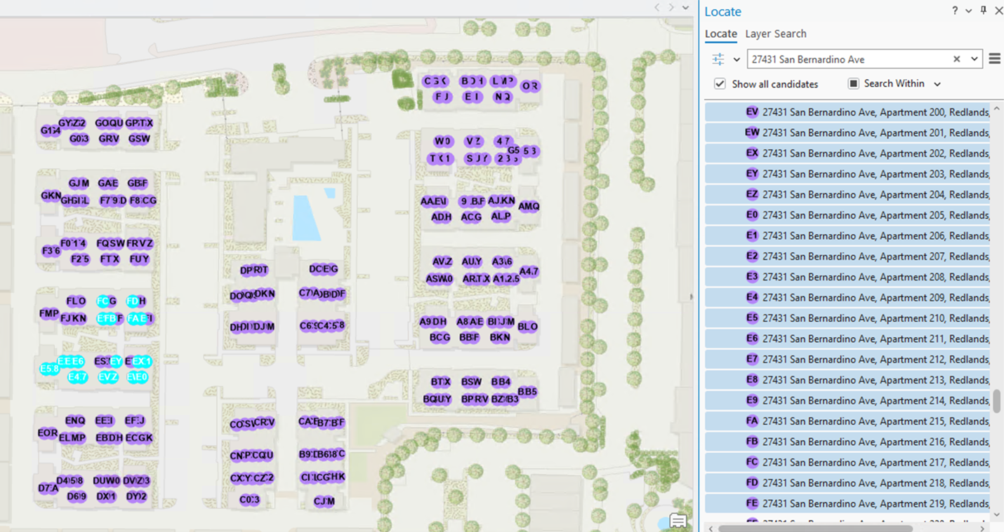 Reviewing a long list of addresses: If the caller is in a building with a lot of units, the dispatcher may see a long list. To assist with this, the Locate Pane sorts the matches based on their type: address, subaddress, or POI, and provide an indicator of the number of matches. Further, the Locate pane will show the first 50 candidates, and as you scroll in the pane, they will see more candidates listed. The map display will update to highlight the current list of candidates in the Locate Pane. The Locate Pane provides further insight through the address summary.