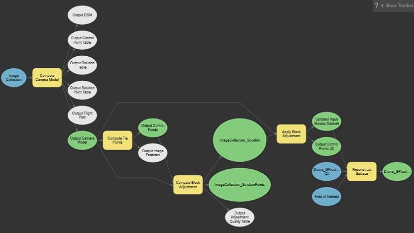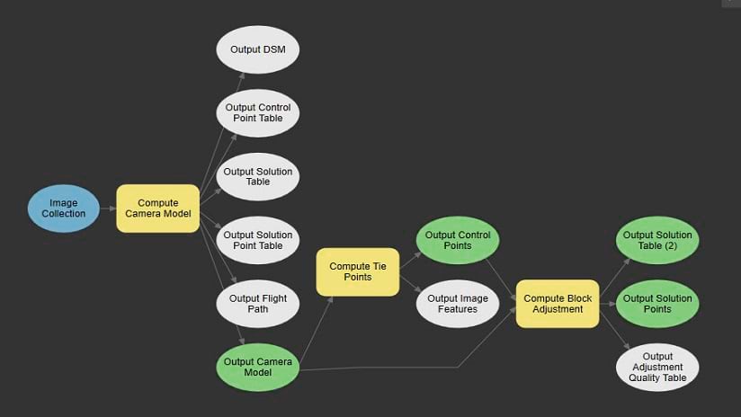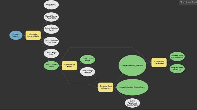The general workflow to process drone imagery includes the computation of a camera model, extraction of tie points in each image, Bundle Block Adjustment of the image location and orientation and then reconstruction of the 3D point cloud into additional output products such as a True Ortho, Digital Surface Model and a 3D mesh. ArcGIS Pro has hundreds of GP tools which can be accessed from the Tools pane and can be linked together through ArcGIS Pro ModelBuilder. The GP tools required for drone image processing are listed here: