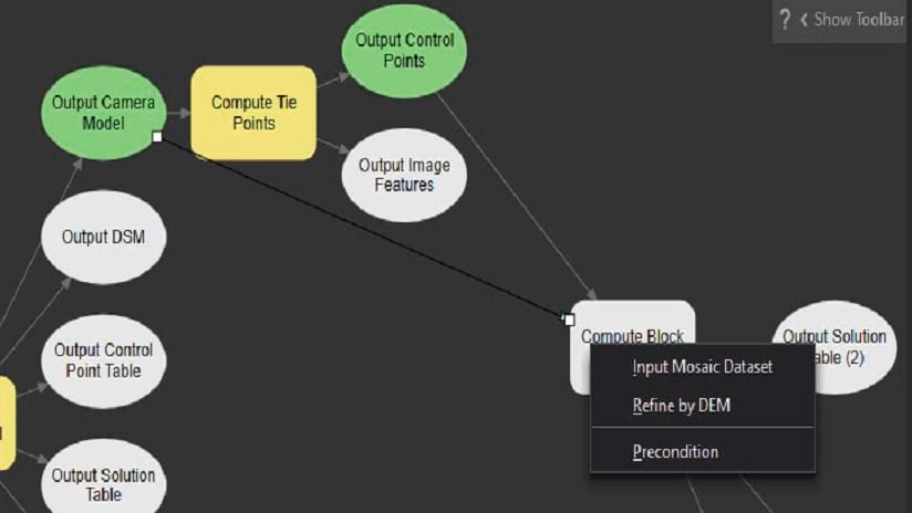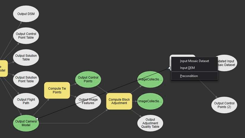 Our next step is to find the “Compute Block Adjustment” tool and drag it into the model. This tool requires a mosaic dataset and a control points table as input. We connect between the “Output Control Points” box and the “Compute Block Adjustment” box (defined as Input Control Points) and between the “Output Camera Model” box and the “Compute Block Adjustment” box (defined as Input Mosaic Dataset).