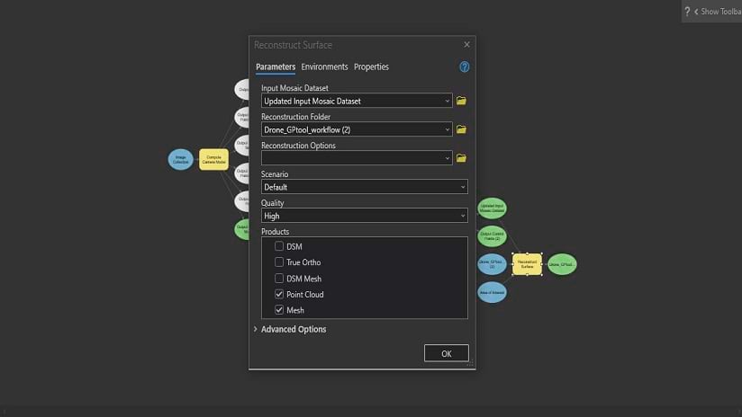 With these processes defined, we can now find the “Reconstruct Surface” tool and drag it into the model. This will require a Mosaic Dataset as input, and we will define it by connecting between the “Updated Input Mosaic Dataset” box and the “Reconstruct Surface” box and defining it as the Input Mosaic Dataset. Once we have established this connection, double-click the “Reconstruct Surface” box and in the “Products” list check the different products you wish to generate in this workflow. In addition, review the “Reconstruction Folder” and make sure you define the output folder where your results will be stored.