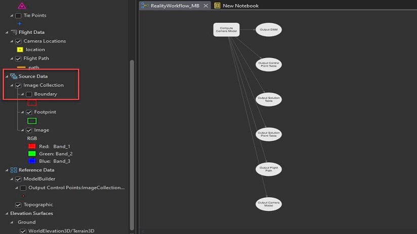 We will start with finding the “Compute Camera Model” tool and then dragging it into the Model we created. The tool needs a Mosaic Dataset as input so we will drag into the model the “Image Collection” mosaic dataset which was created as part of the Reality Workspace. This can be found in the Reality Mapping pane under the “Source Data” layer group.