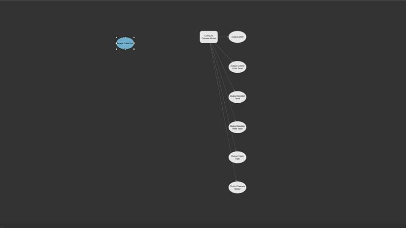 Now, we will connect this mosaic dataset to the “Compute Camera Model” tool by dragging a line from the “Image Collection” box to the “Compute Camera Model” box. When we connect to the GP toolbox it will show a pop-up with the option to define this as the Input Mosaic Dataset. Now we have the first process complete it will show the “Output Camera Model” in green to indicate that the process has been configured correctly. In some of the screenshots we have changed the layout slightly by pressing the “Auto Layout” button in the ModelBuilder tab. This helps us organize the different components of our model in a way that’s easier to understand.
