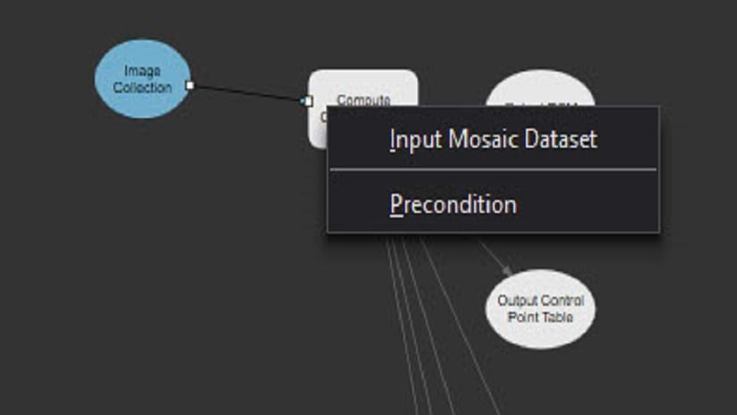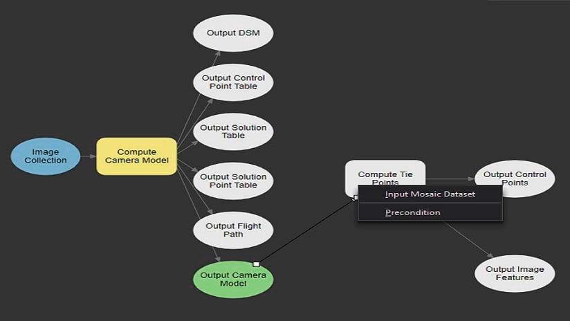 We continue by finding the “Compute Tie Points” tool and dragging it into the model. This tool also requires a Mosaic Dataset as input, so we will define the “Output Camera Model” as the input and drag a line from this box to the “Compute Tie Points” box and select the Input Mosaic Dataset option. With this process complete we will see the “Output Control Points” box colored in green.
