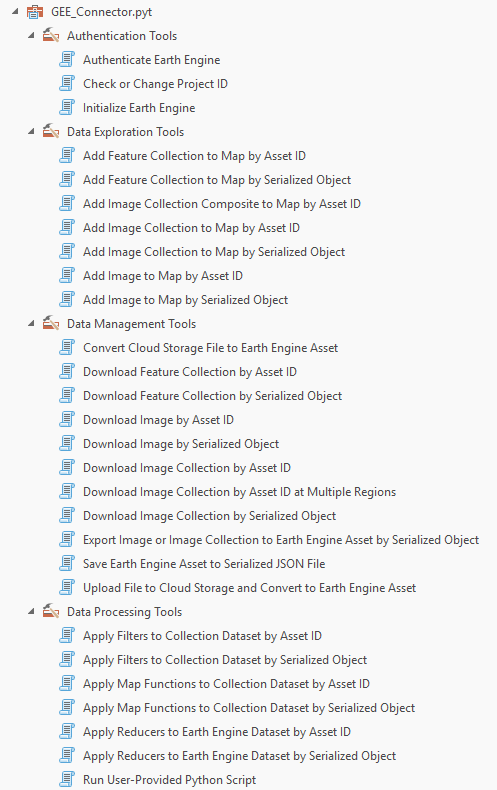 - Explore the tools. With the tools, use the GUI as a no-code method to connect to GEE data catalog, assets, and functions. You can also transfer data from ArcGIS Pro to GEE