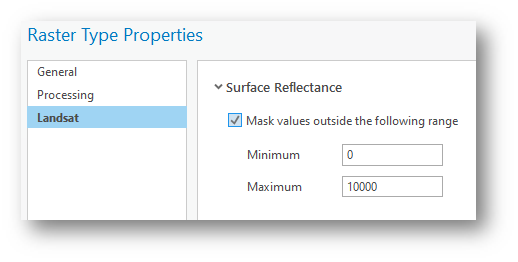 - In the Landsat section of the Raster Type Properties window, check the box to Mask values outside the following range, and enter 0 and 10000 as the minimum and maximum, respectively.