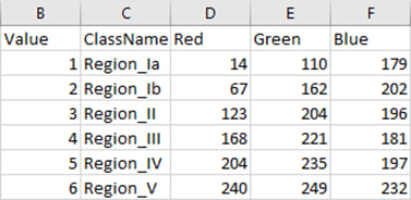 Now I have a multidimensional raster with values from 1 to 6 representing the six suitability regions. To associate the values with region names and the display color for each region, I create a CSV file containing a table with following records: