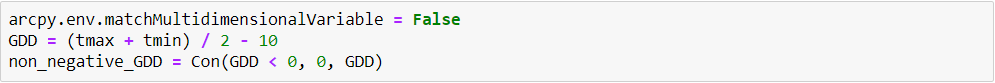 You can see that the multidimensional algebra makes the coding very simple, and I’m able to use operators on multidimensional rasters and compute the daily GDD over 39 years easily. Since the formula involves two rasters with different names, I must set an environment setting matchMultidimensionalVariable to False.