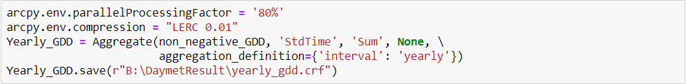 To calculate the total GDD of the growing season for each year, I use the Aggregate function and then save the process result as a CRF file. Since the dataset is large and the time series is long, I define the parallel processing factor and compression environment settings to speed up the process of data creation.