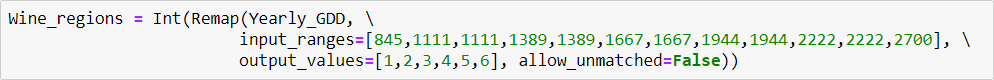 To apply the Winkler index to the analysis, I use the Remap raster function to remap the GDD ranges into six classes with values from 1 to 6: