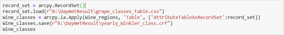 Next, I apply the table to the suitability region raster using a Raster Attribute Table function. Since there is not an explicit ArcPy function yet for the Raster Attribute Table raster function, I use Apply, an ArcPy function designed for processing using raster functions in ArcPy environment. In the code, ‘Table’ is the name of Raster Attribute Table function, and it takes a RecordSet as an argument. The result is a time series of wine suitability region classification from 1980 to 2018.