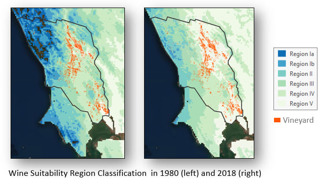 To find which areas are affected, I used the wine region classification time series generated previously, and compared changes in Sonoma, a county that produces the most and some of the best wines in California. You can see that areas suitable for high quality grapes and wines have shrunk, and the very few vineyards that were Region_Ia class in 1980 fall in Region III in 2018. Although there was no big change on the total pixel counts of Region_Ib, the areas shifted, which will affect the type and quality of grapes and wines produced in those areas