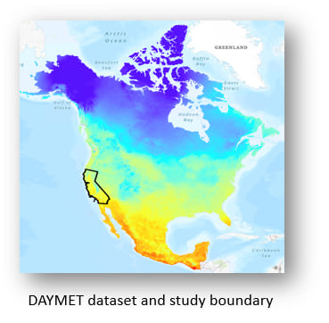 GDD is calculated based on daily minimum and maximum temperatures. The DAYMET dataset contains many climate variables with a temporal resolution and spatial resolution suitable for this study. I downloaded 58 NetCDF files which contain the two variables tmax and tmin—these are the daily minimum and maximum temperatures from 1980 to 2018. To bring this data together, l created a mosaic dataset that references these 58 NetCDF files. Since my study area is California, I used California state boundaries from this service to clip and convert the mosaic dataset to a multidimensional Cloud Raster Format (CRF), which is Esri’s preferred format for storing multidimensional raster data such as this climate data. See this topic for steps on how to create a multidimensional CRF from your scientific data. Now I have the input data that I need.