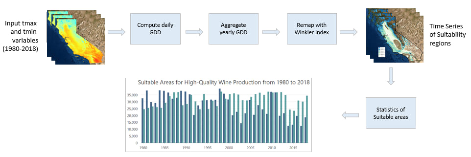 The analysis workflow steps include computing daily GDD from the input temperature variables, aggregating into yearly GDD, classifying the regions using the Winkler index, and computing the statistics of the areas for each class across the 39 years to look at the trend.