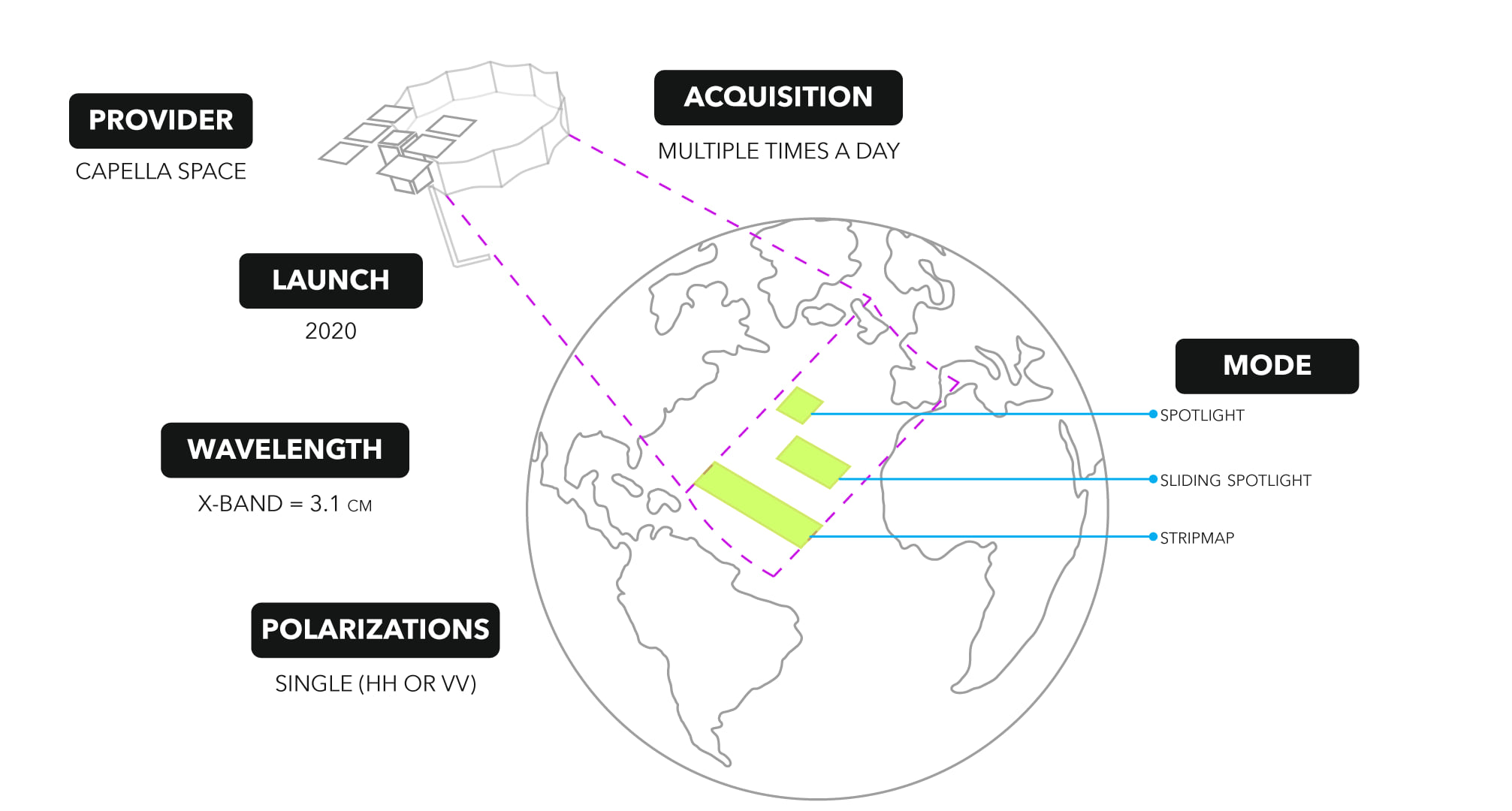 Many SAR sensors are available and supported as raster types in ArcGIS Pro and each has various products and polarizations. The Capella satellites collect data in three imaging modes: Stripmap (SM), Sliding Spotlight (SS), and Spotlight (SP), with coverage of greater than 100 kilometers and resolution better than 0.5 meters.