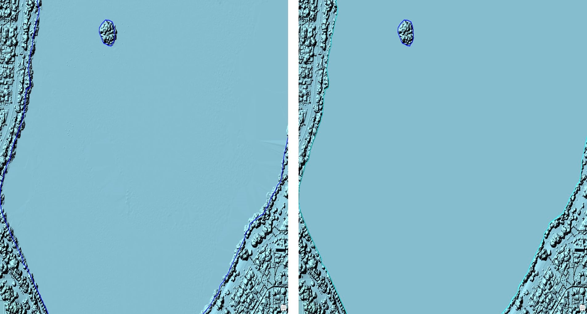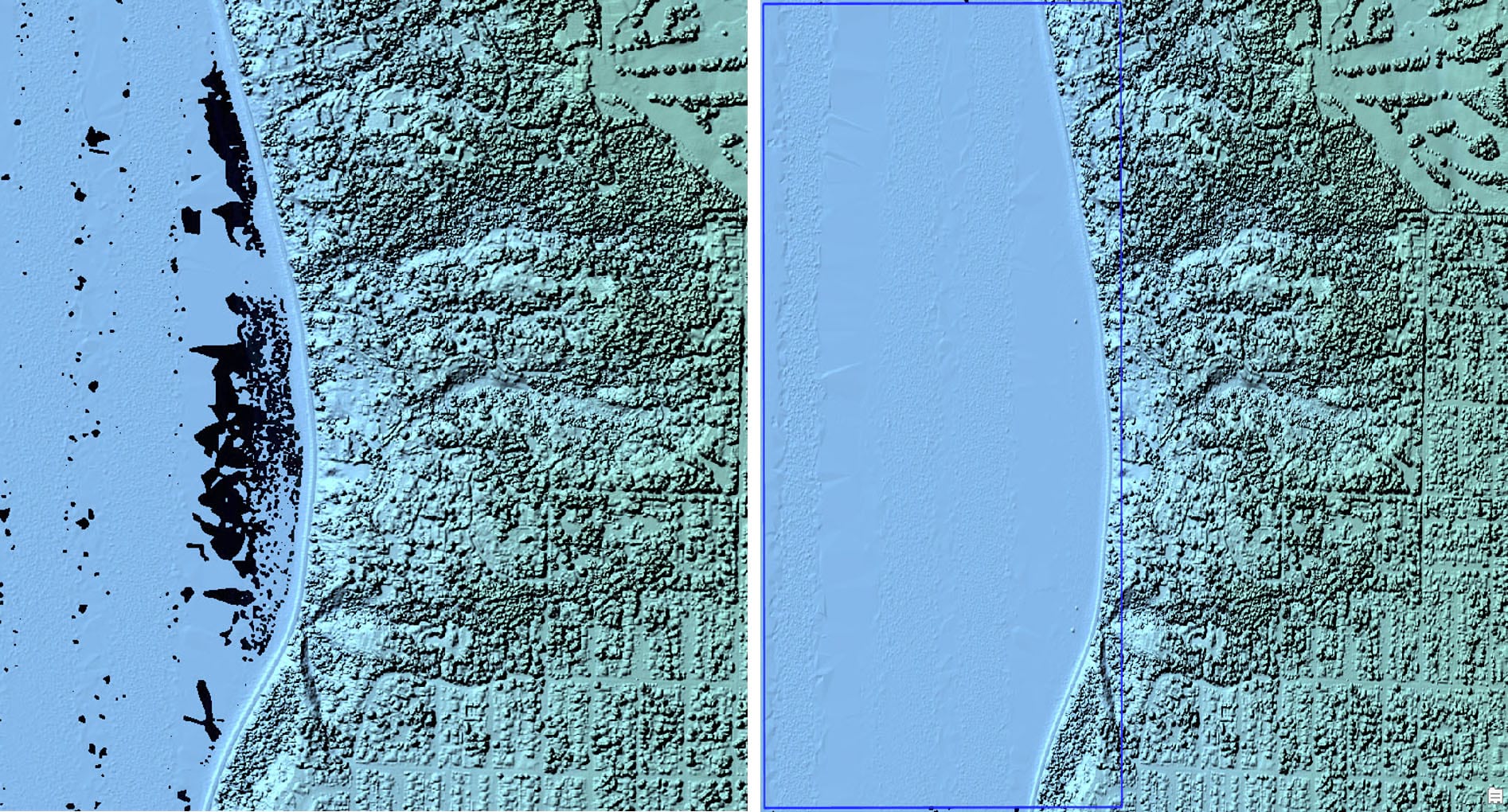 Water bodies are notoriously problematic areas for Lidar due to the light absorption properties. Additionally, water bodies can have boats, buoys, or vegetation on or above the surface, where overhang from nearby trees can cause undesirable artifacts in the resulting raster dataset. Let’s look at how the Pixel Editor can address some of these situations. In the image below, we can see there is quite a bit of NoData off the coastal area. I addressed this by using the Fill Voids operator during my edit session.