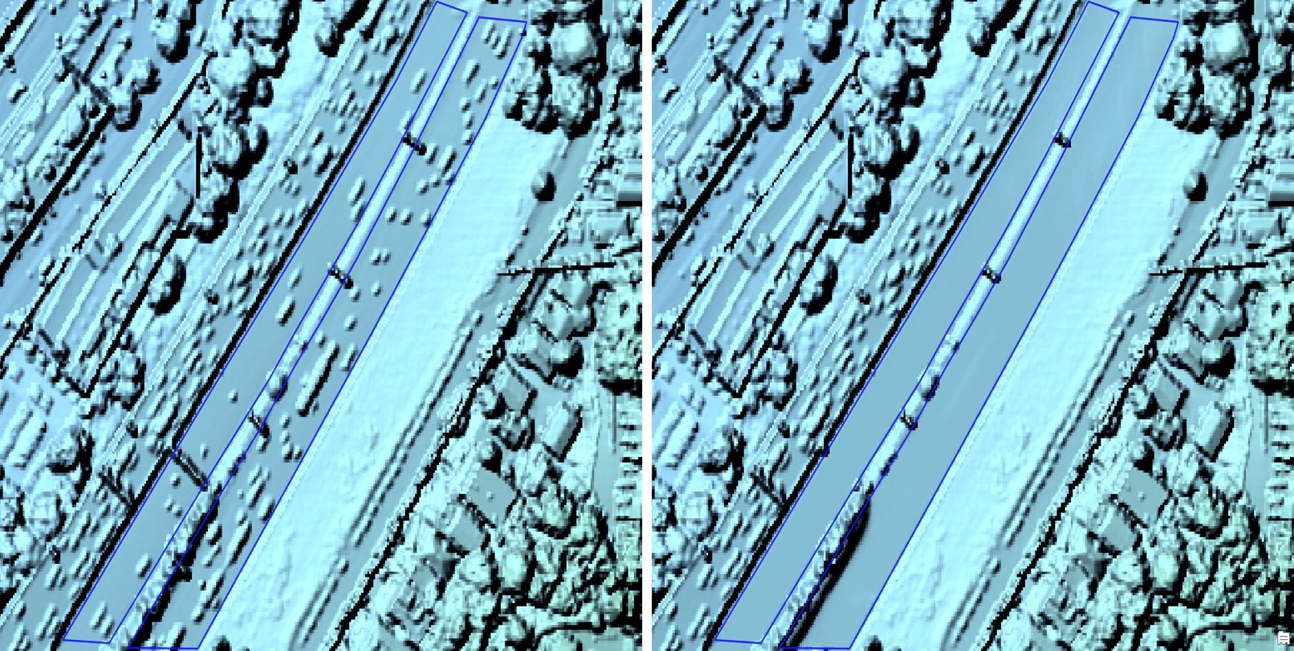 In the next example we can see things like cars and freeway signs impacting road conditions. Using the Average Filter or the Median Filter works really well on roadways to remove these surface features. Fixing roadways, bridges, and overpasses may be necessary to produce an acceptable elevation model to be used for orthorectification.