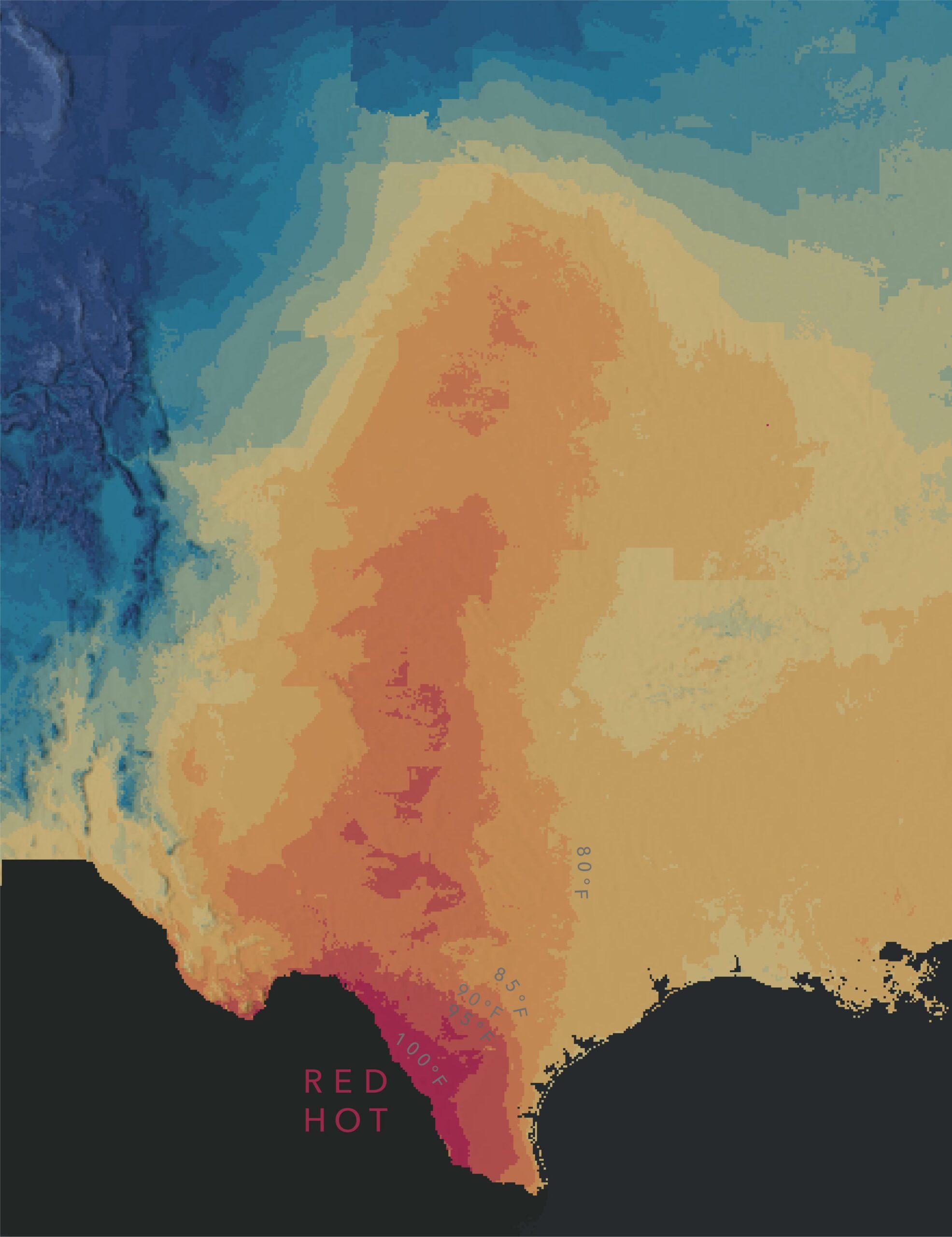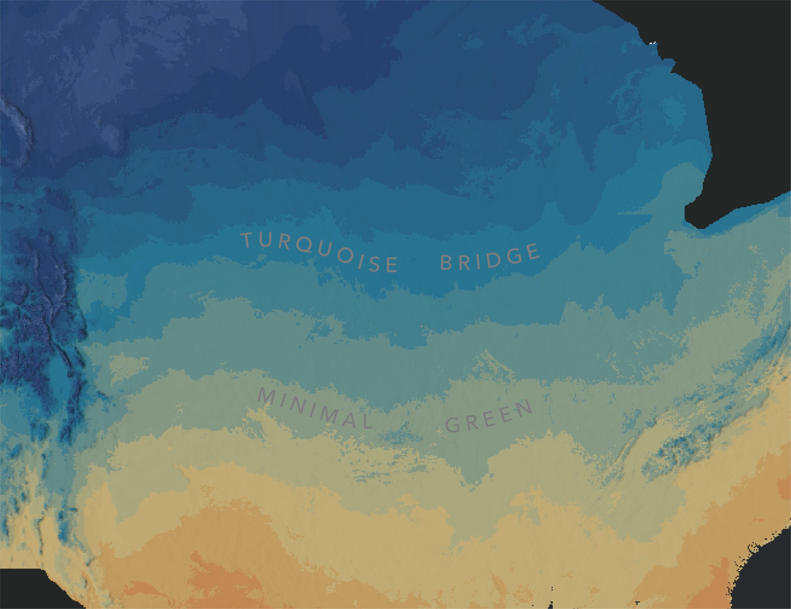 The cartography must present temperature information without bias. There is no hierarchy in this layer, just numerical order. The emphasis of the palette colors should be equitable in that sense. The hot oranges should not appear more prominently than the cooler teals. This took finessing with the saturation and brightness levels with the 10 color stops to make the cooler colors appear in similar intensity as hotter ones.