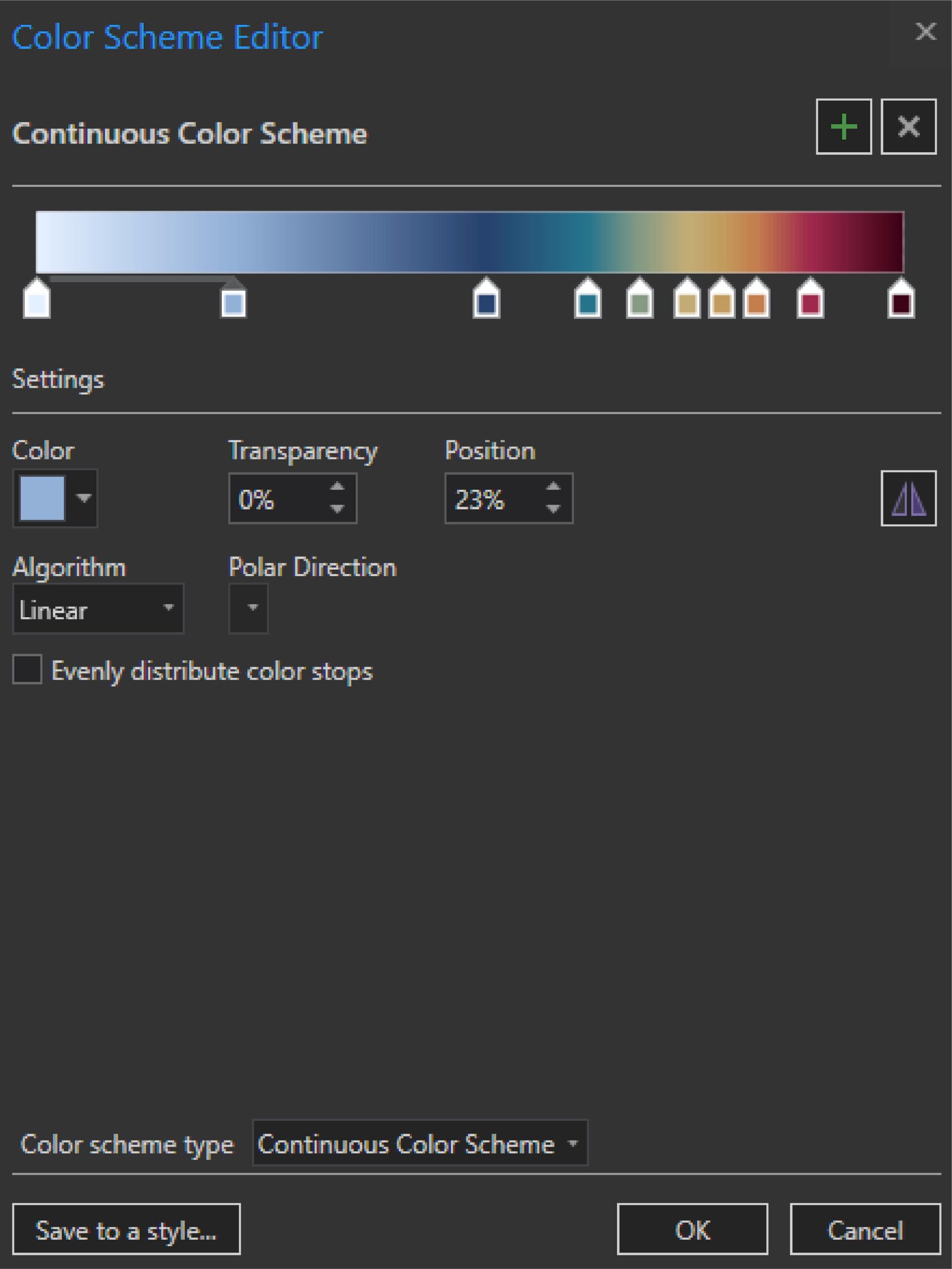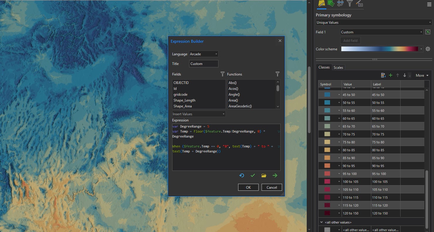 How was this palette created? In ArcGIS Pro we used an Arcade expression to classify the temperature values into five-degree increment breaks so that a color could be assigned to every class. Then we used Unique Values and applied a Continuous Color Scheme to mix up the colors into a seamless gradient.