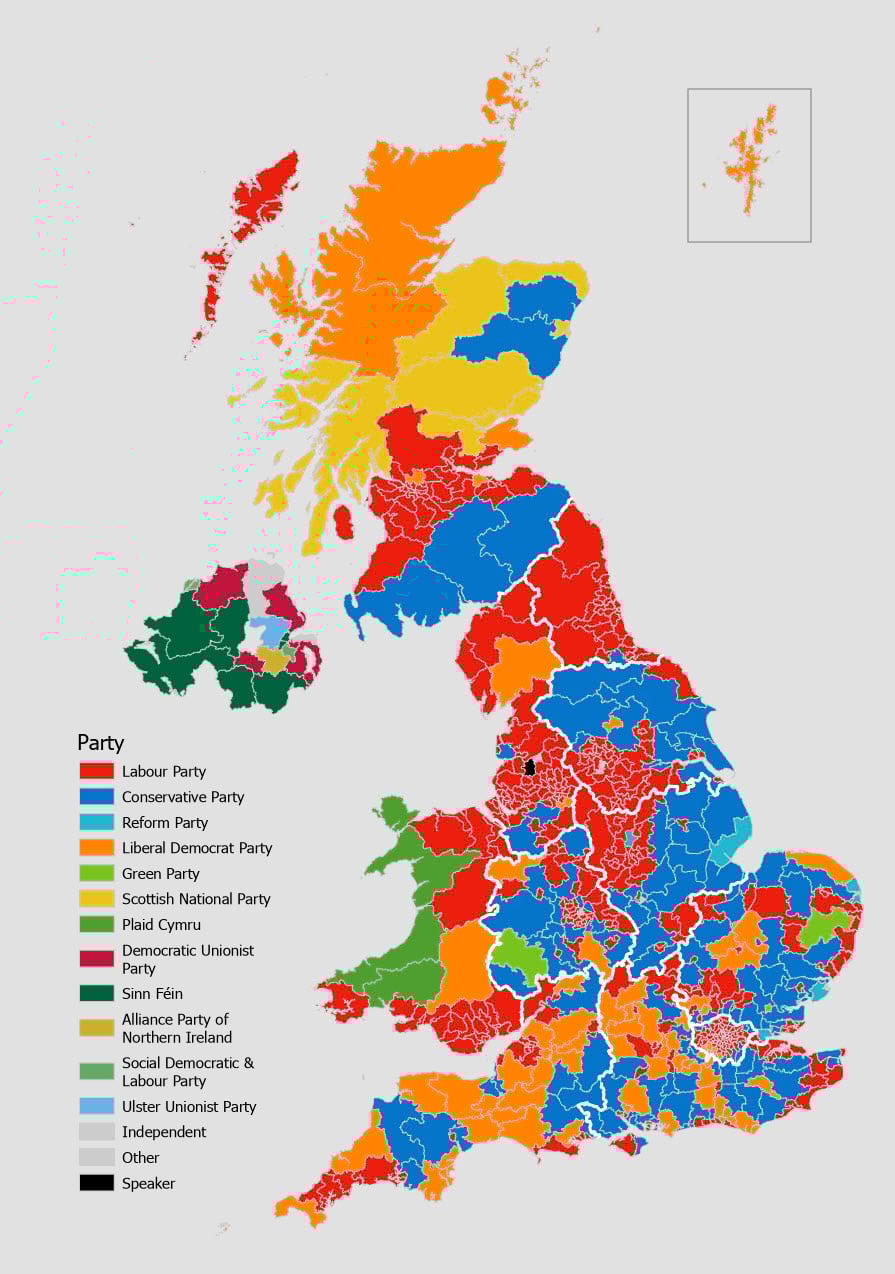In the rest of this blog I’ll share what I did with the data, and offer a few ways you can lean into a similar approach for your maps of whatever data you think might be suited to the techniques I’ll share. First, some background. The UK is split into 650 political constituencies. Political parties offer a candidate in each constituency, and the candidate who wins gains a ‘seat’, and becomes an MP (Member of Parliament) in the Houses of Parliament. Crucially, they score ‘one’ which is added to the party totals and the party that gains 326 is first-past-the-post and forms the new government. The leader of the party becomes the new Prime Minister. It’s quite common for many different parties to put forward candidates, and despite the main battle being almost always between the Conservative (right-leaning) and Labour (left-leaning) parties there are always constituencies that are won by other parties or Independent candidates. While the Conservatives are conventionally shown in blue, and Labour in red (the inverse of the typical US colour coding), the final map is often far more colourful than the US equivalent. Here, then is the standard map of the results from the July 4th General Election.