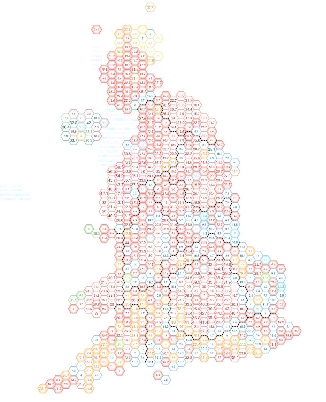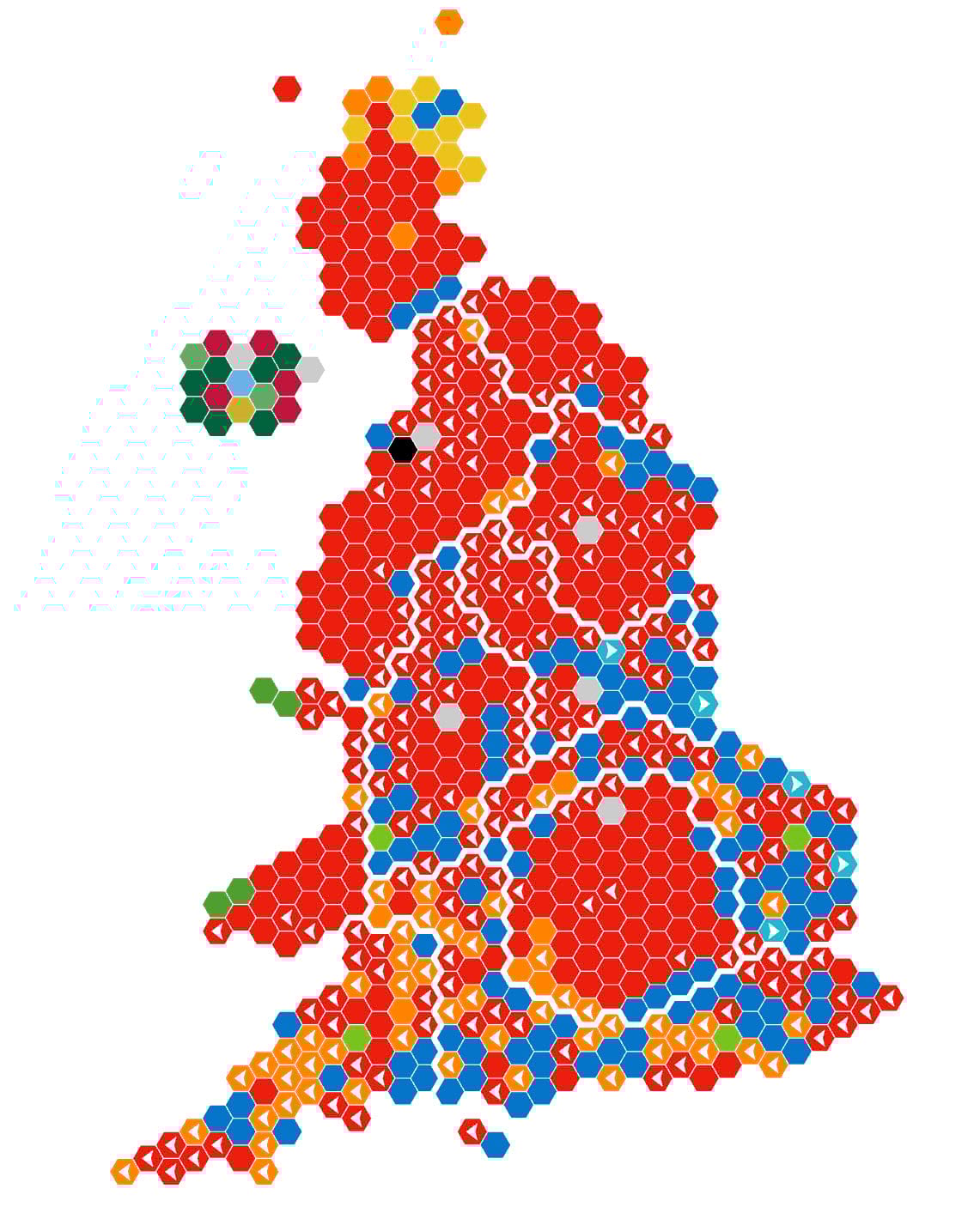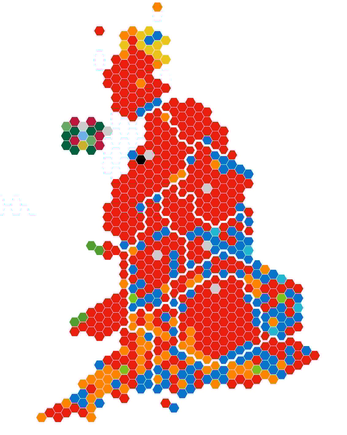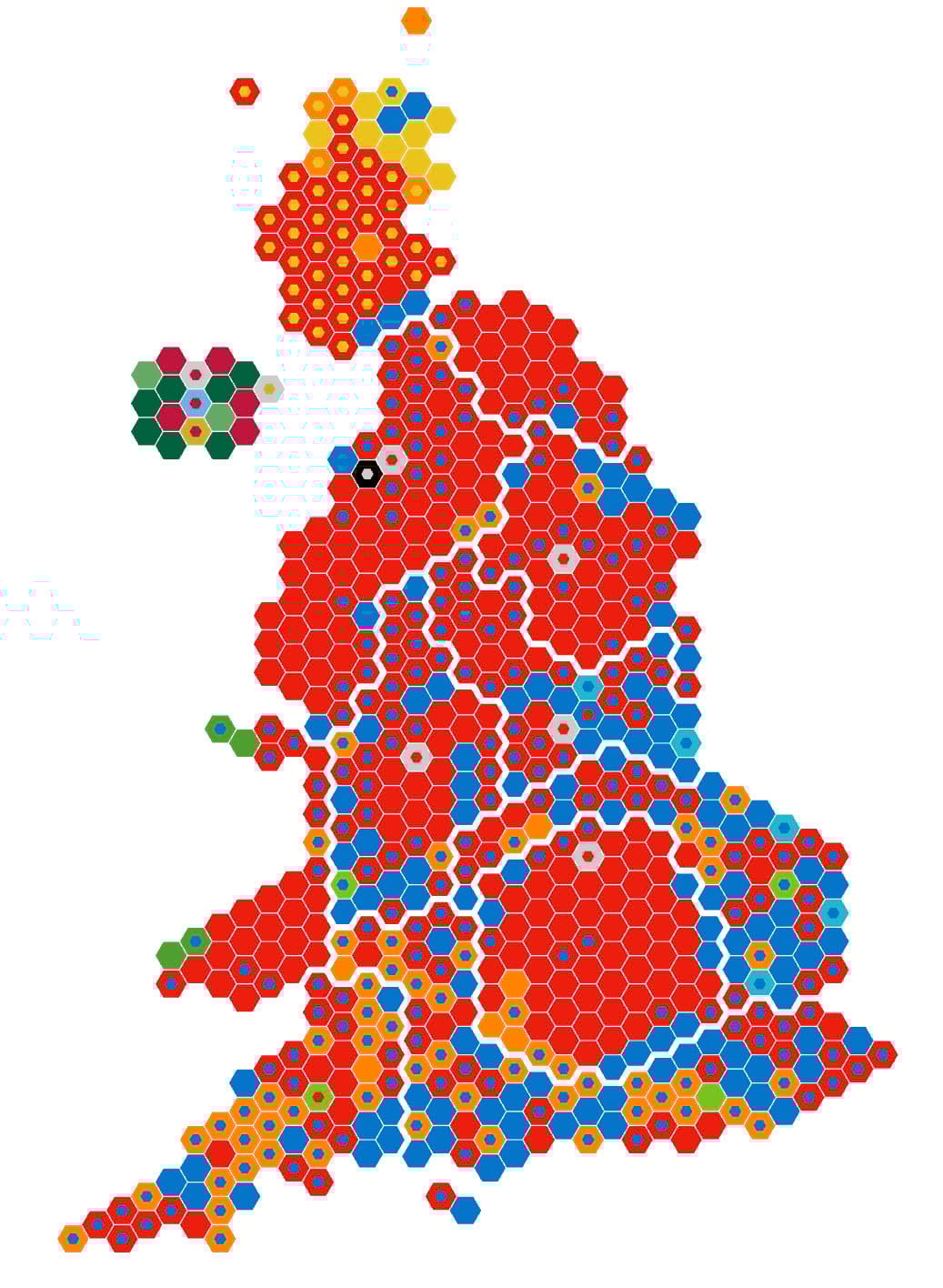 One way of overcoming this problem is to equalize the geography altogether by using a gridded cartogram. There’s many different types of cartogram one might consider but gridded cartograms work well when you need to create a perception of relative areal symbology, and to overcome the problems of small areas having low visual priority. Here’s one possible way of tessellating space into a set of 650 equally sized hexagons, each showing the same result as the map above.